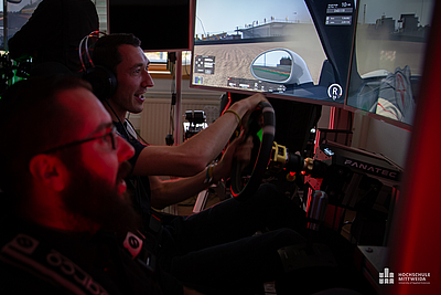 Der Workshop stellt daher neben den Anwendungszwecken virtueller Welten im eSport und dem Versicherungswesen auch innovative Lehrkonzepte vor, welche Studierende auf die Arbeit mit den neusten Technologien und agilen Arbeits-, Zeit- und Teammanagement vorbereiten. Zwei Männer sitzen vor einem Monitor und simulieren ein Motorsport-Event.